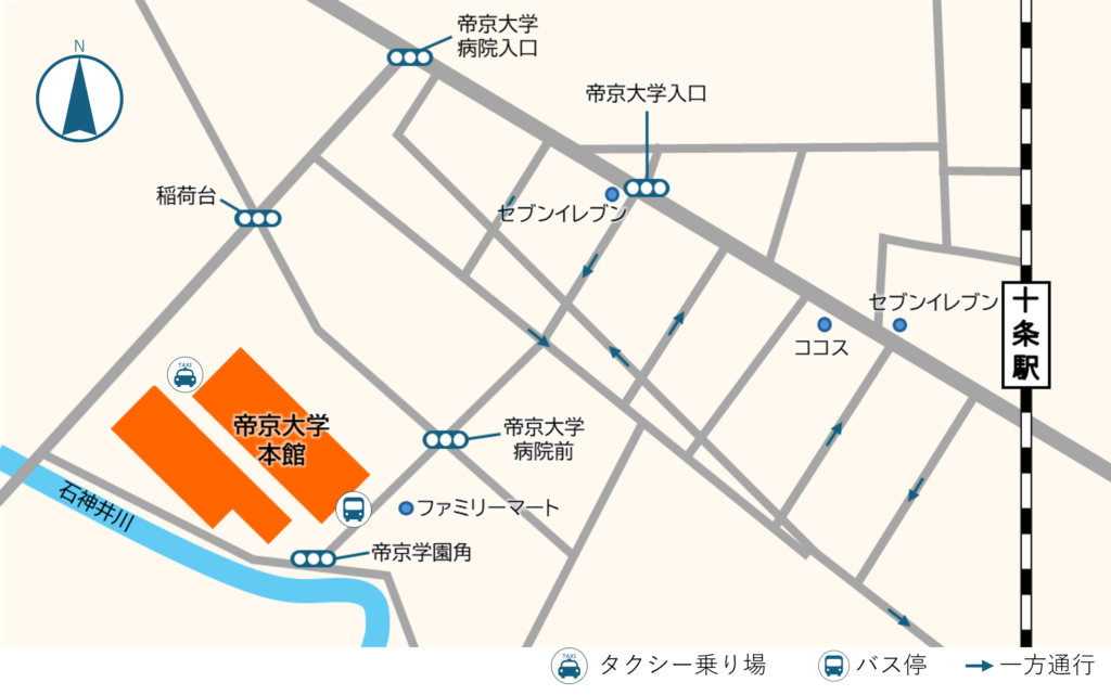 - 国際興業バス 7番のりば → 赤羽駅西口行(所要約15分)「帝京大学病院正面」下車